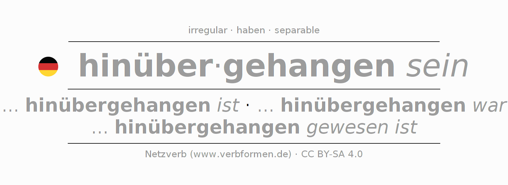 - Present: ... ich hinübergehangen bin, ... du hinübergehangen bist, ... er hinübergehangen ist, ... wir hinübergehangen sind, ... ihr hinübergehangen seid, ... sie hinübergehangen sind