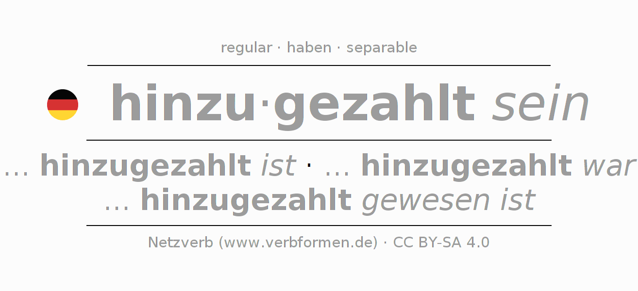 - Future Perfect: ... ich hinzugezahlt gewesen sein werde, ... du hinzugezahlt gewesen sein wirst, ... er hinzugezahlt gewesen sein wird, ... wir hinzugezahlt gewesen sein werden, ... ihr hinzugezahlt gewesen sein werdet, ... sie hinzugezahlt gewesen sein werden