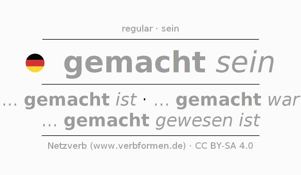 Clear online presentation of the verb 'gemacht sein' including all verb forms. Therfore, the flection of the verb gemacht sein can be useful for homework, tests, exams, German lessons in school, learning German, during studies and adult education. Especially for people learning German it is essential to know the correct flection of a verb (... gemacht ist - ... gemacht war - ... gemacht gewesen ist).