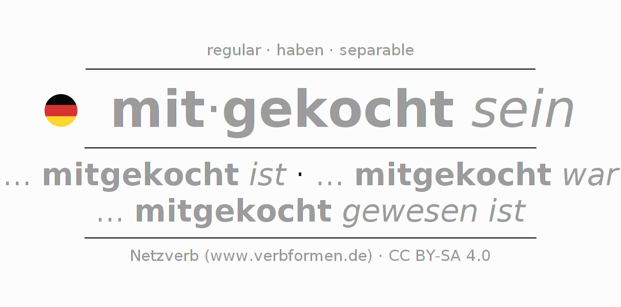 The conjugation of the verb mitkochen (cook together, simmer together) is regular. Basic forms are ... mitgekocht ist, ... mitgekocht war and ... mitgekocht gewesen ist. The auxiliary verb of mitkochen is haben. First syllable mit- of mitkochen is separable. The flection is in Statal Passive and the use as Subordinate. For a better understanding, countless examples of the verb mitkochen are available. For practicing and consolidating, there are also free worksheets for mitkochen. You can not just mitkochen conjugate, but all German verbs. Comments ☆