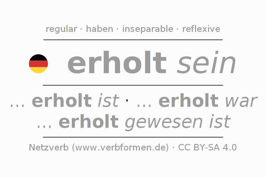 - Future: ... ich erholt sein werde, ... du erholt sein werdest, ... er erholt sein werde, ... wir erholt sein werden, ... ihr erholt sein werdet, ... sie erholt sein werden
