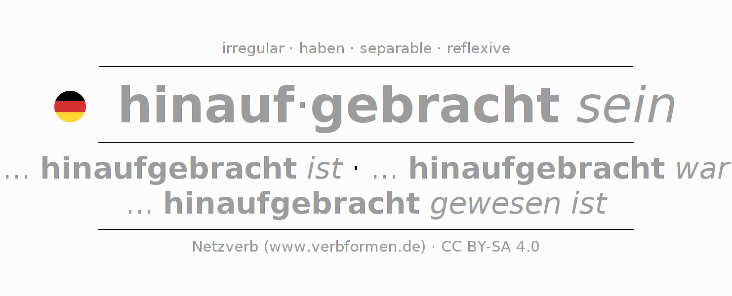 Clear online presentation of the verb 'hinauf·gebracht sein' including all verb forms. Therfore, the flection of the verb hinauf·gebracht sein can be useful for homework, tests, exams, German lessons in school, learning German, during studies and adult education. Especially for people learning German it is essential to know the correct flection of a verb (... hinaufgebracht ist - ... hinaufgebracht war - ... hinaufgebracht gewesen ist).