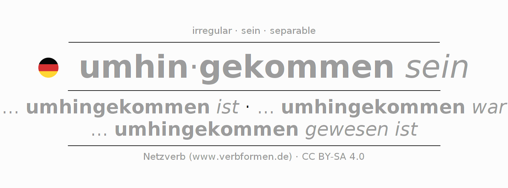 - Future Perfect: ... ich umhingekommen gewesen sein werde, ... du umhingekommen gewesen sein werdest, ... er umhingekommen gewesen sein werde, ... wir umhingekommen gewesen sein werden, ... ihr umhingekommen gewesen sein werdet, ... sie umhingekommen gewesen sein werden