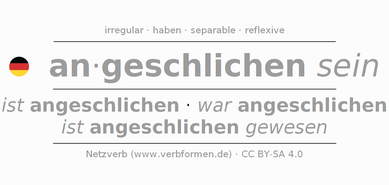 Clear online presentation of the verb 'an·geschlichen sein' including all verb forms. Therfore, the flection of the verb an·geschlichen sein can be useful for homework, tests, exams, German lessons in school, learning German, during studies and adult education. Especially for people learning German it is essential to know the correct flection of a verb (ist angeschlichen - war angeschlichen - ist angeschlichen gewesen).