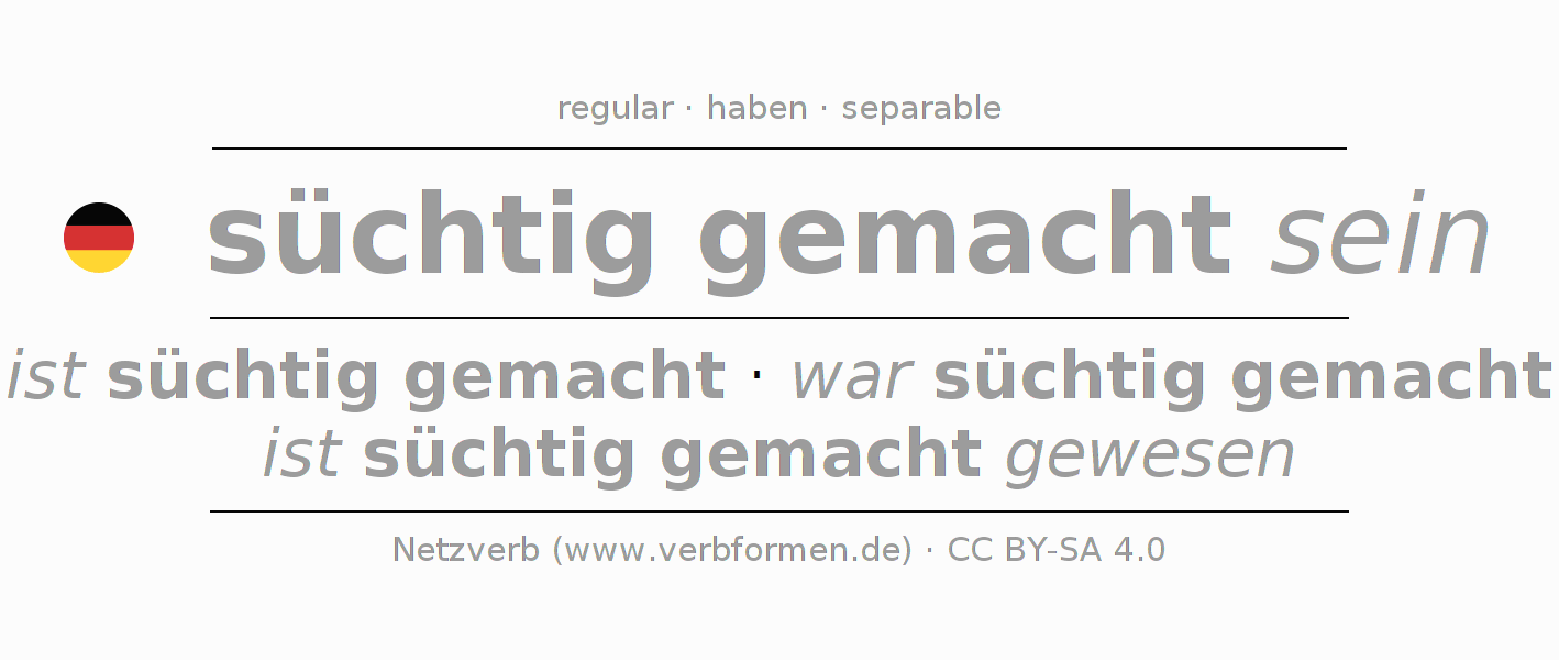 - Infinitive II: süchtig gemacht gewesen sein, süchtig gemacht gewesen zu sein