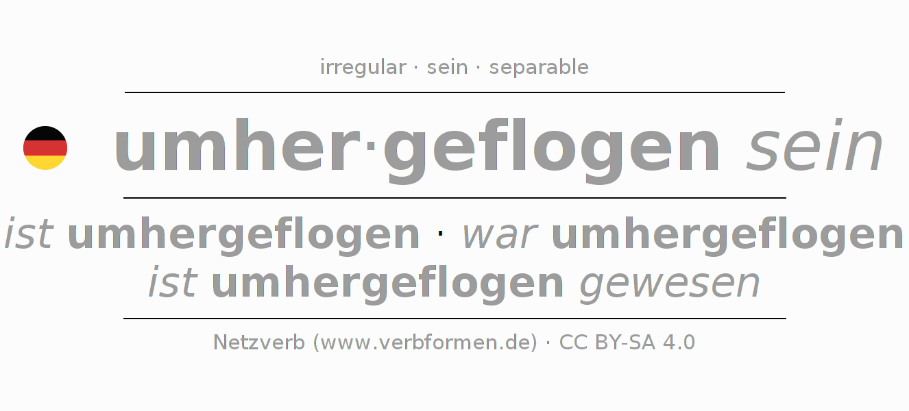 - Future Perfect: ich werde umhergeflogen gewesen sein, du werdest umhergeflogen gewesen sein, er werde umhergeflogen gewesen sein, wir werden umhergeflogen gewesen sein, ihr werdet umhergeflogen gewesen sein, sie werden umhergeflogen gewesen sein