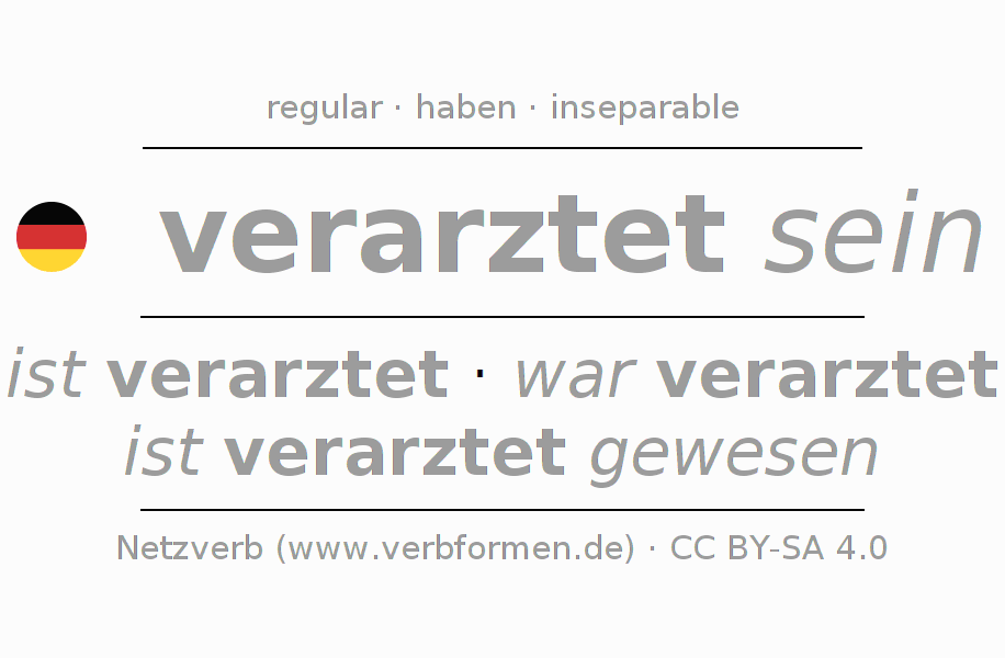 - Present: ich bin verarztet, du bist verarztet, er ist verarztet, wir sind verarztet, ihr seid verarztet, sie sind verarztet