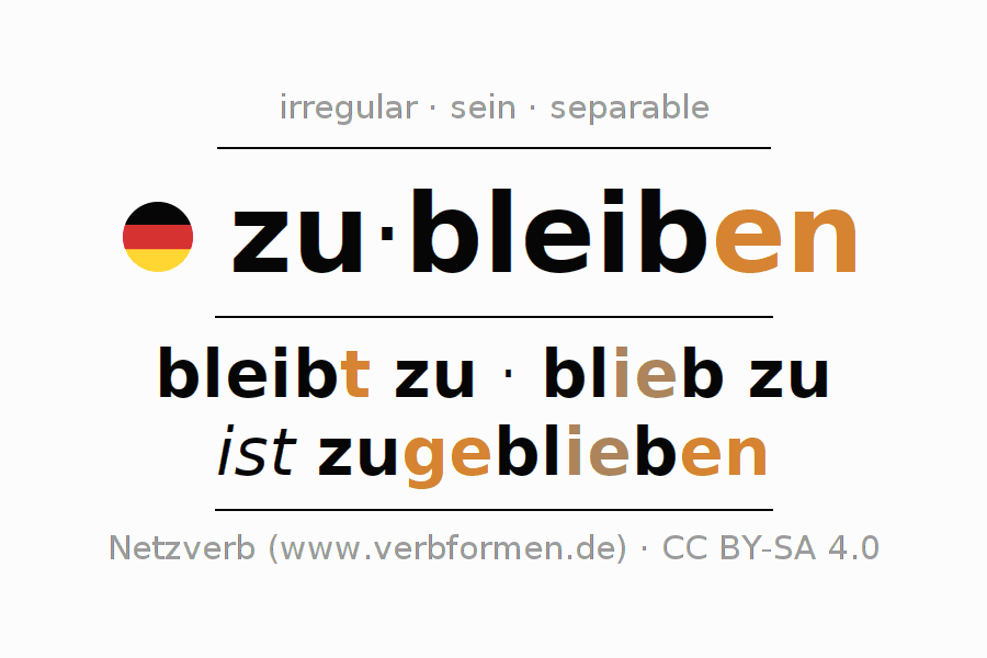 Clear online presentation of the verb 'zu·bleiben' including all verb forms. Therfore, the flection of the verb zu·bleiben can be useful for homework, tests, exams, German lessons in school, learning German, during studies and adult education. Especially for people learning German it is essential to know the correct flection of a verb (bleibt zu - blieb zu - ist zugeblieben).