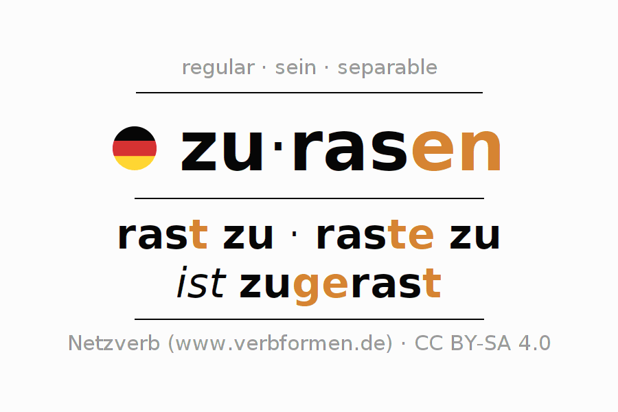 - Present: ras(e) (du) zu, rasen wir zu, rast (ihr) zu, rasen Sie zu
