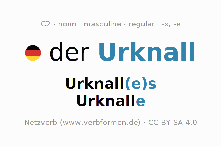 The declension of Urknall as a table with all forms in singular (singular) and plural (plural) and in all four cases nominative (1st case), genitive (2nd case), dative (3rd case) and accusative (4th case). Especially for German learners the correct declension of the word Urknall is crucial.