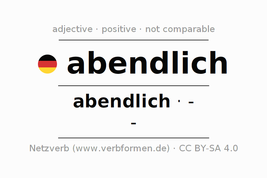 The declension of the adjective abendlich (evening, vespertine) uses the incomparable form abendlich. The adjective has no forms for the comparative and superlative. The adjective abendlich can be used both attributively in front of a noun as well as predicative in conjunction with a verb.One can not only inflect and compare abendlich, but all German adjectives. Comments ☆