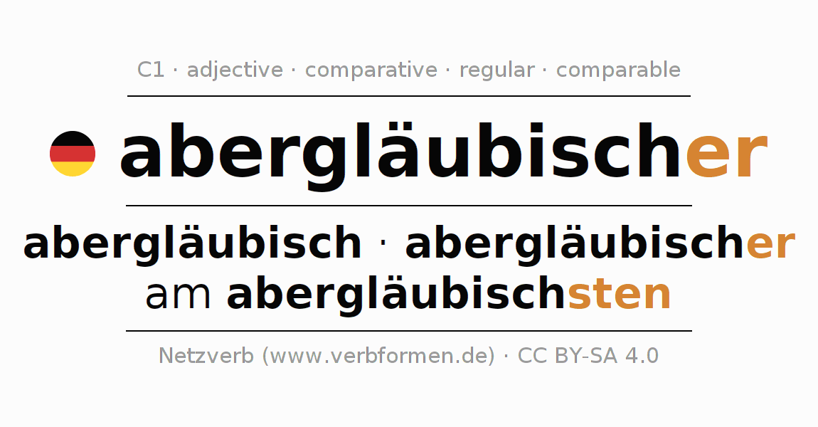 The declension of the adjective abergläubischer (superstitious) uses these forms of the comparison abergläubisch,abergläubischer,am abergläubischsten. The endings for the comparison in the comparative and superlative are er/sten. The adjective abergläubischer can be used both attributively in front of a noun as well as predicative in conjunction with a verb.One can not only inflect and compare abergläubischer, but all German adjectives. Comments ☆