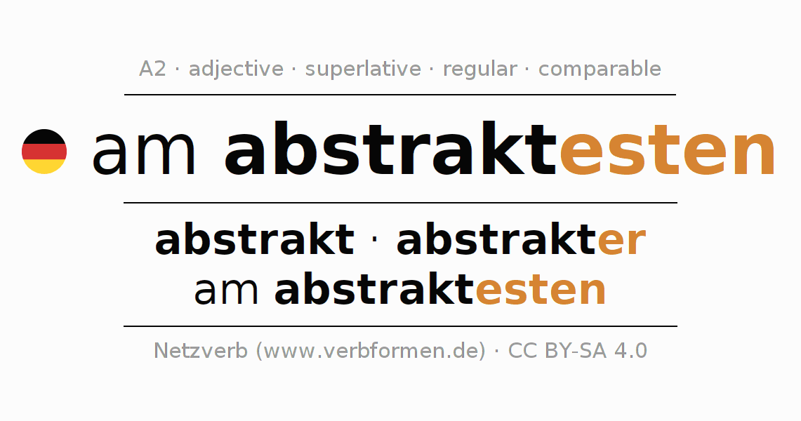 The declension of the adjective am abstraktesten (abstract, conceptional) uses these forms of the comparison abstrakt,abstrakter,am abstraktesten. The endings for the comparison in the comparative and superlative are er/esten. The adjective am abstraktesten can be used both attributively in front of a noun as well as predicative in conjunction with a verb.One can not only inflect and compare am abstraktesten, but all German adjectives. Comments ☆