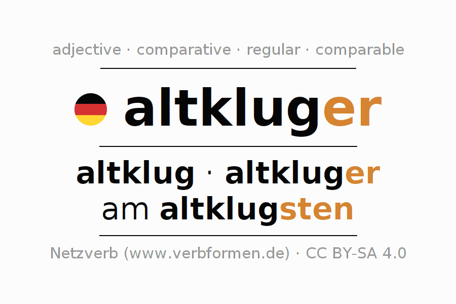 The declension of the adjective altkluger (precocious, wise beyond one's years) uses these forms of the comparison altklug,altkluger,am altklugsten. The endings for the comparison in the comparative and superlative are er/sten. The adjective altkluger can be used both attributively in front of a noun as well as predicative in conjunction with a verb.One can not only inflect and compare altkluger, but all German adjectives. Comments ☆
