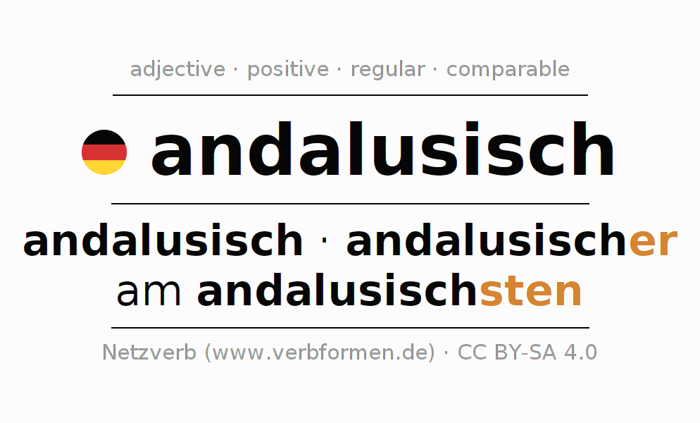 The declension of the adjective andalusisch (Andalusian) uses these forms of the comparison andalusisch,andalusischer,am andalusischsten. The endings for the comparison in the comparative and superlative are er/sten. The adjective andalusisch can be used both attributively in front of a noun as well as predicative in conjunction with a verb.One can not only inflect and compare andalusisch, but all German adjectives. Comments ☆