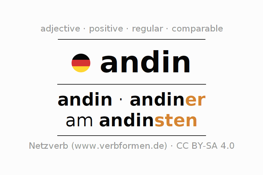 The declension of the adjective andin (Andean) uses these forms of the comparison andin,andiner,am andinsten. The endings for the comparison in the comparative and superlative are er/sten. The adjective andin can be used both attributively in front of a noun as well as predicative in conjunction with a verb.One can not only inflect and compare andin, but all German adjectives. Comments ☆