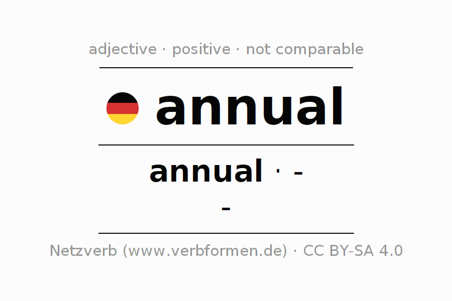 The declension of the adjective annual uses the incomparable form annual. The adjective has no forms for the comparative and superlative. The adjective annual can be used both attributively in front of a noun as well as predicative in conjunction with a verb.One can not only inflect and compare annual, but all German adjectives. Comments ☆