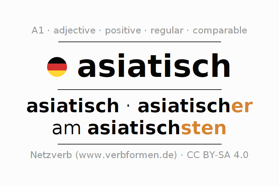 The declension of the adjective asiatisch (Asian) uses these forms of the comparison asiatisch,asiatischer,am asiatischsten. The endings for the comparison in the comparative and superlative are er/sten. The adjective asiatisch can be used both attributively in front of a noun as well as predicative in conjunction with a verb.One can not only inflect and compare asiatisch, but all German adjectives. Comments ☆