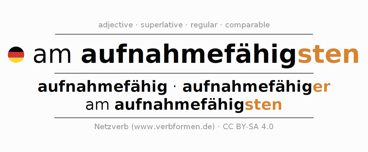 The declension of the adjective am aufnahmefähigsten (receptive, capable of integration) uses these forms of the comparison aufnahmefähig,aufnahmefähiger,am aufnahmefähigsten. The endings for the comparison in the comparative and superlative are er/sten. The adjective am aufnahmefähigsten can be used both attributively in front of a noun as well as predicative in conjunction with a verb.One can not only inflect and compare am aufnahmefähigsten, but all German adjectives. Comments ☆