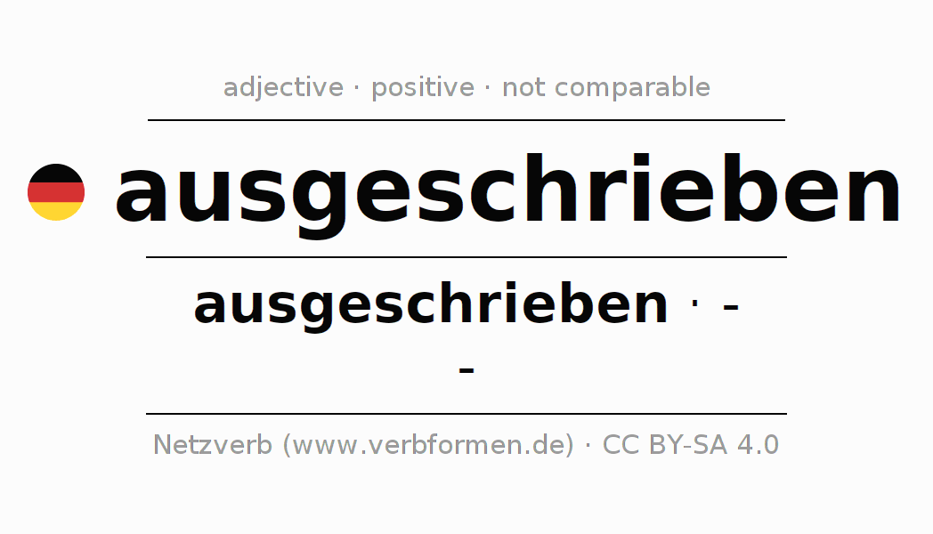 The declension of the adjective ausgeschrieben (fully expressed, spelled out) uses the incomparable form ausgeschrieben. The adjective has no forms for the comparative and superlative. The adjective ausgeschrieben can be used both attributively in front of a noun as well as predicative in conjunction with a verb.One can not only inflect and compare ausgeschrieben, but all German adjectives. Comments ☆