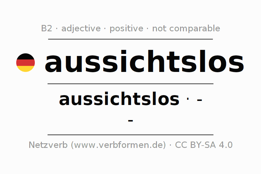 The declension of the adjective aussichtslos (hopeless, despairing) uses the incomparable form aussichtslos. The adjective has no forms for the comparative and superlative. The adjective aussichtslos can be used both attributively in front of a noun as well as predicative in conjunction with a verb.One can not only inflect and compare aussichtslos, but all German adjectives. Comments ☆
