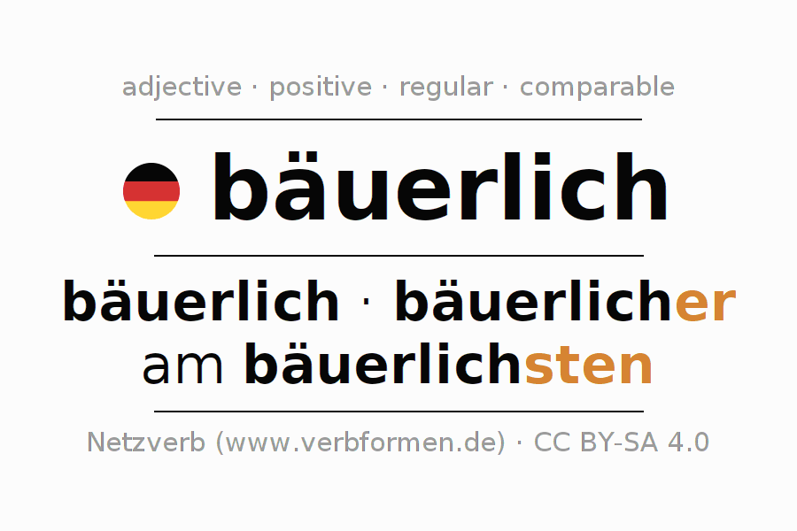 The declension of the adjective bäuerlich (rural, agricultural) uses these forms of the comparison bäuerlich,bäuerlicher,am bäuerlichsten. The endings for the comparison in the comparative and superlative are er/sten. The adjective bäuerlich can be used both attributively in front of a noun as well as predicative in conjunction with a verb.One can not only inflect and compare bäuerlich, but all German adjectives. Comments ☆