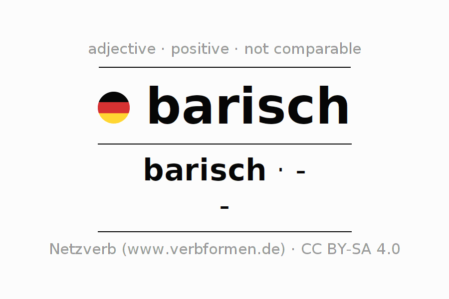 The declension of the adjective barisch uses the incomparable form barisch. The adjective has no forms for the comparative and superlative. The adjective barisch can be used both attributively in front of a noun as well as predicative in conjunction with a verb.One can not only inflect and compare barisch, but all German adjectives. Comments ☆