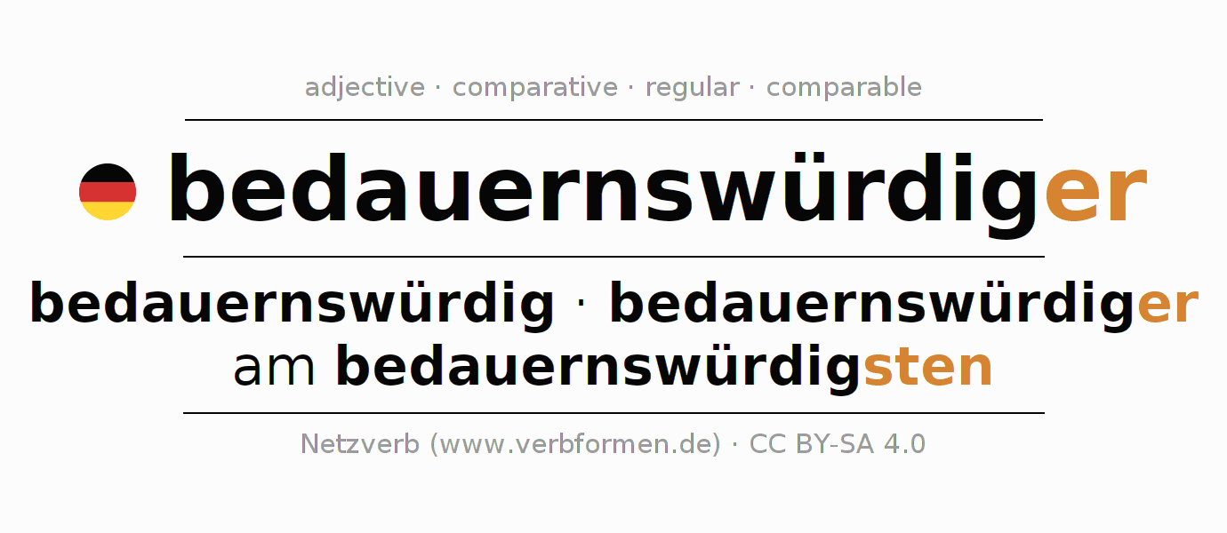 The declension of the adjective bedauernswürdiger (lamentable, regrettable) uses these forms of the comparison bedauernswürdig,bedauernswürdiger,am bedauernswürdigsten. The endings for the comparison in the comparative and superlative are er/sten. The adjective bedauernswürdiger can be used both attributively in front of a noun as well as predicative in conjunction with a verb.One can not only inflect and compare bedauernswürdiger, but all German adjectives. Comments ☆