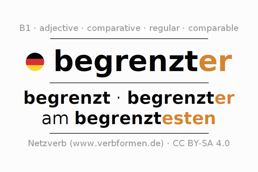 The declension of the adjective begrenzter (limited, restricted) uses these forms of the comparison begrenzt,begrenzter,am begrenztesten. The endings for the comparison in the comparative and superlative are er/esten. The adjective begrenzter can be used both attributively in front of a noun as well as predicative in conjunction with a verb.One can not only inflect and compare begrenzter, but all German adjectives. Comments ☆
