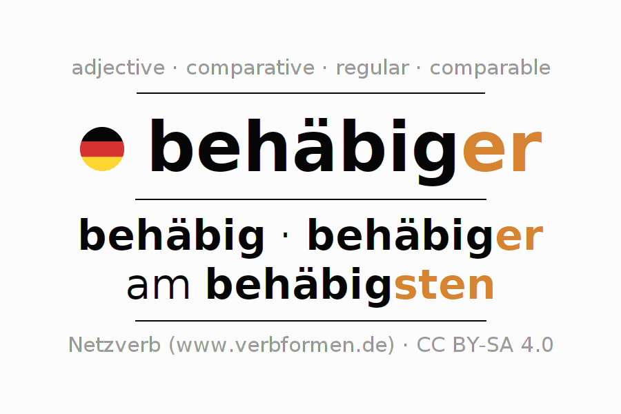 The declension of the adjective behäbiger (bulky, cumbersome) uses these forms of the comparison behäbig,behäbiger,am behäbigsten. The endings for the comparison in the comparative and superlative are er/sten. The adjective behäbiger can be used both attributively in front of a noun as well as predicative in conjunction with a verb.One can not only inflect and compare behäbiger, but all German adjectives. Comments ☆