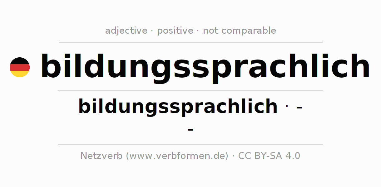 The declension of the adjective bildungssprachlich (erudite, academic) uses the incomparable form bildungssprachlich. The adjective has no forms for the comparative and superlative. The adjective bildungssprachlich can be used both attributively in front of a noun as well as predicative in conjunction with a verb.One can not only inflect and compare bildungssprachlich, but all German adjectives. Comments ☆