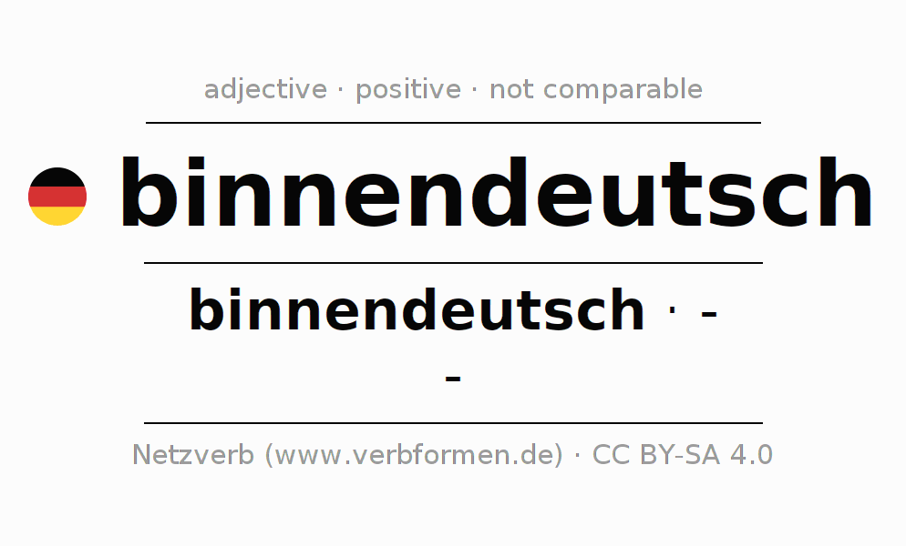 The declension of the adjective binnendeutsch (domestic, internal) uses the incomparable form binnendeutsch. The adjective has no forms for the comparative and superlative. The adjective binnendeutsch can be used both attributively in front of a noun as well as predicative in conjunction with a verb.One can not only inflect and compare binnendeutsch, but all German adjectives. Comments ☆