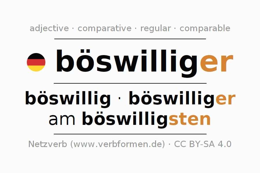 The declension of the adjective böswilliger (malevolent, malicious) uses these forms of the comparison böswillig,böswilliger,am böswilligsten. The endings for the comparison in the comparative and superlative are er/sten. The adjective böswilliger can be used both attributively in front of a noun as well as predicative in conjunction with a verb.One can not only inflect and compare böswilliger, but all German adjectives. Comments ☆