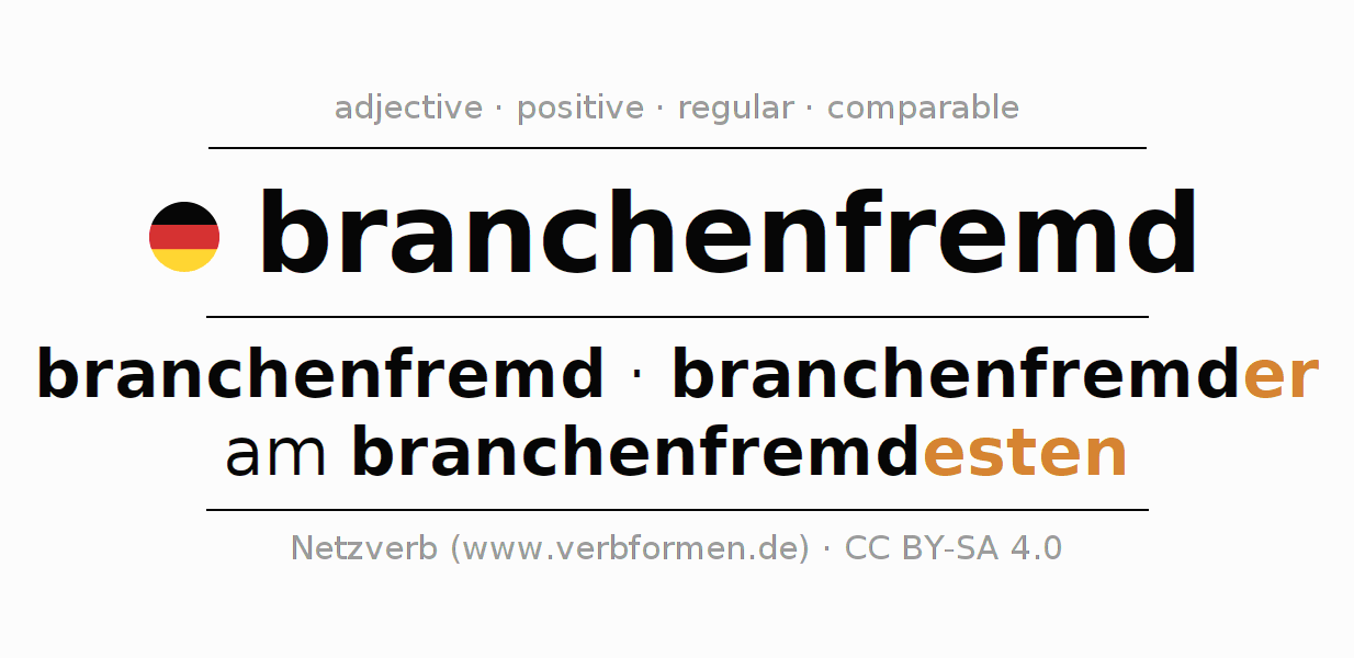 The declension of the adjective branchenfremd (outside the industry, unrelated) uses these forms of the comparison branchenfremd,branchenfremder,am branchenfremdesten. The endings for the comparison in the comparative and superlative are er/esten. The adjective branchenfremd can be used both attributively in front of a noun as well as predicative in conjunction with a verb.One can not only inflect and compare branchenfremd, but all German adjectives. Comments ☆