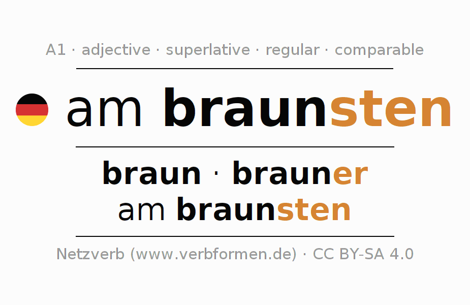 The declension of the adjective am braunsten (brown, dark brown) uses these forms of the comparison braun,brauner,am braunsten. The endings for the comparison in the comparative and superlative are er/sten. The adjective am braunsten can be used both attributively in front of a noun as well as predicative in conjunction with a verb.One can not only inflect and compare am braunsten, but all German adjectives. Comments ☆