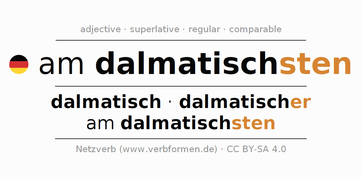 The declension of the adjective am dalmatischsten (Dalmatian) uses these forms of the comparison dalmatisch,dalmatischer,am dalmatischsten. The endings for the comparison in the comparative and superlative are er/sten. The adjective am dalmatischsten can be used both attributively in front of a noun as well as predicative in conjunction with a verb.One can not only inflect and compare am dalmatischsten, but all German adjectives. Comments ☆