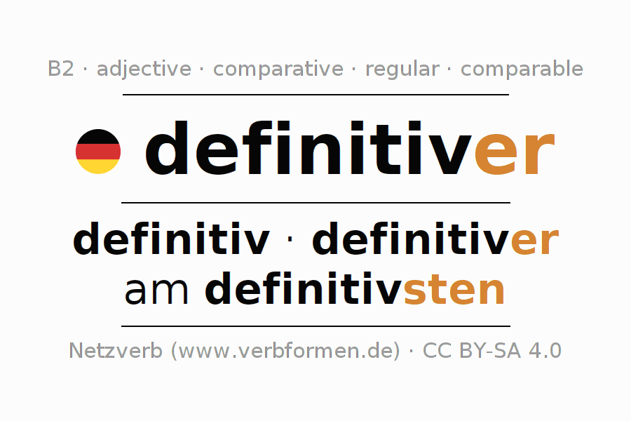 The declension of the adjective definitiver (definite, definitive) uses these forms of the comparison definitiv,definitiver,am definitivsten. The endings for the comparison in the comparative and superlative are er/sten. The adjective definitiver can be used both attributively in front of a noun as well as predicative in conjunction with a verb.One can not only inflect and compare definitiver, but all German adjectives. Comments ☆