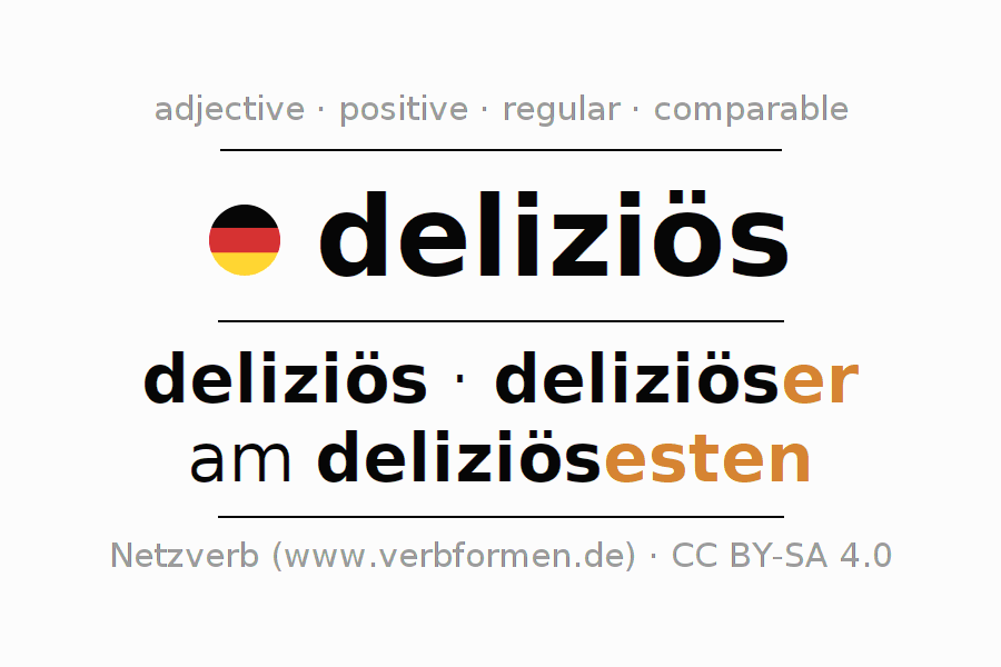 The declension of the adjective deliziös (delicious, delectable) uses these forms of the comparison deliziös,deliziöser,am deliziösesten. The endings for the comparison in the comparative and superlative are er/esten. The adjective deliziös can be used both attributively in front of a noun as well as predicative in conjunction with a verb.One can not only inflect and compare deliziös, but all German adjectives. Comments ☆