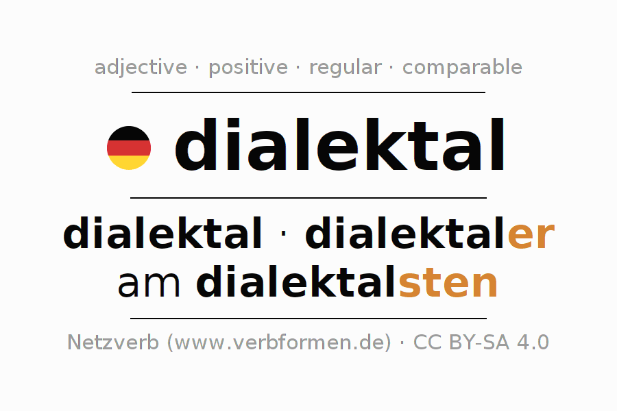 The declension of the adjective dialektal (dialectal, regional) uses these forms of the comparison dialektal,dialektaler,am dialektalsten. The endings for the comparison in the comparative and superlative are er/sten. The adjective dialektal can be used both attributively in front of a noun as well as predicative in conjunction with a verb.One can not only inflect and compare dialektal, but all German adjectives. Comments ☆