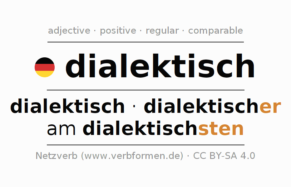 The declension of the adjective dialektisch (dialectical, dialectal) uses these forms of the comparison dialektisch,dialektischer,am dialektischsten. The endings for the comparison in the comparative and superlative are er/sten. The adjective dialektisch can be used both attributively in front of a noun as well as predicative in conjunction with a verb.One can not only inflect and compare dialektisch, but all German adjectives. Comments ☆