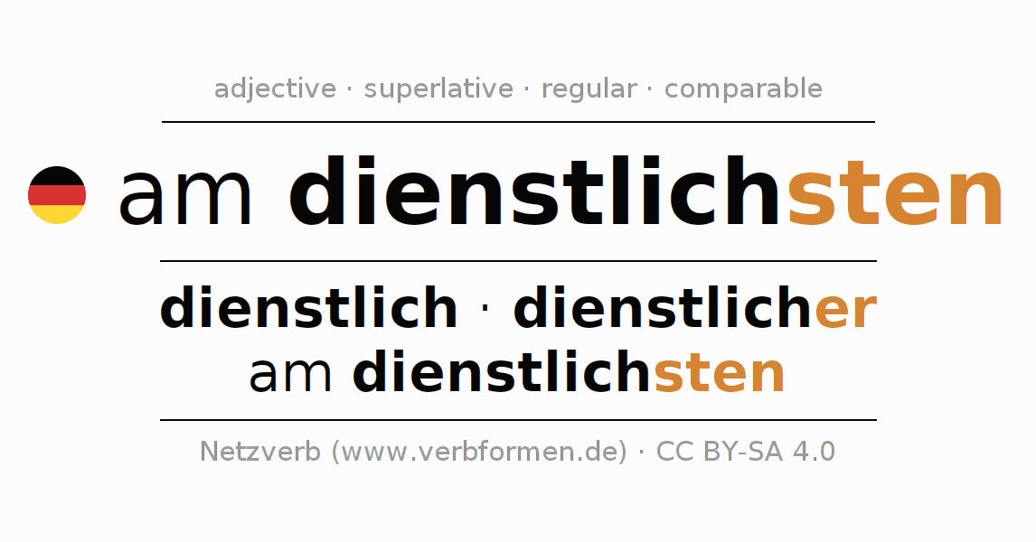 The declension of the adjective am dienstlichsten (business-related, official) uses these forms of the comparison dienstlich,dienstlicher,am dienstlichsten. The endings for the comparison in the comparative and superlative are er/sten. The adjective am dienstlichsten can be used both attributively in front of a noun as well as predicative in conjunction with a verb.One can not only inflect and compare am dienstlichsten, but all German adjectives. Comments ☆