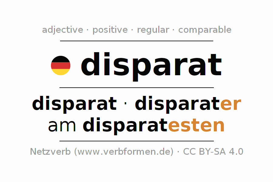 The declension of the adjective disparat (disparate, contradictory) uses these forms of the comparison disparat,disparater,am disparatesten. The endings for the comparison in the comparative and superlative are er/esten. The adjective disparat can be used both attributively in front of a noun as well as predicative in conjunction with a verb.One can not only inflect and compare disparat, but all German adjectives. Comments ☆