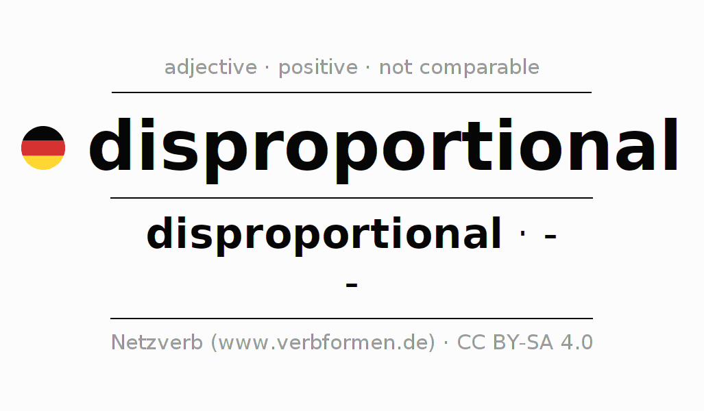 The declension of the adjective disproportional (unequal, disproportionate) uses the incomparable form disproportional. The adjective has no forms for the comparative and superlative. The adjective disproportional can be used both attributively in front of a noun as well as predicative in conjunction with a verb.One can not only inflect and compare disproportional, but all German adjectives. Comments ☆