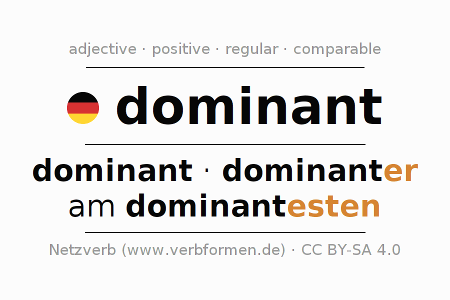 The declension of the adjective dominant (dominant, prevailing) uses these forms of the comparison dominant,dominanter,am dominantesten. The endings for the comparison in the comparative and superlative are er/esten. The adjective dominant can be used both attributively in front of a noun as well as predicative in conjunction with a verb.One can not only inflect and compare dominant, but all German adjectives. Comments ☆