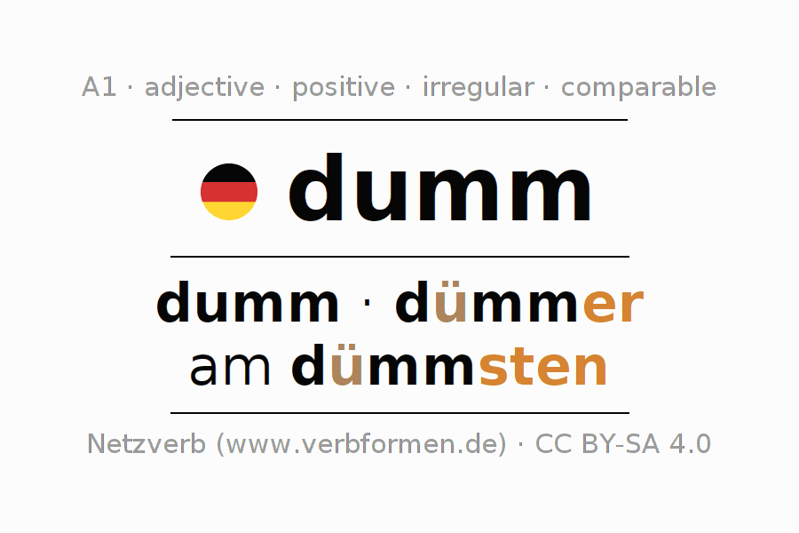 The declension of the adjective dumm (silly, stupid) uses these forms of the comparison dumm,dümmer,am dümmsten. The endings for the comparison in the comparative and superlative are ü-er/ü-sten. The adjective dumm can be used both attributively in front of a noun as well as predicative in conjunction with a verb.One can not only inflect and compare dumm, but all German adjectives. Comments ☆