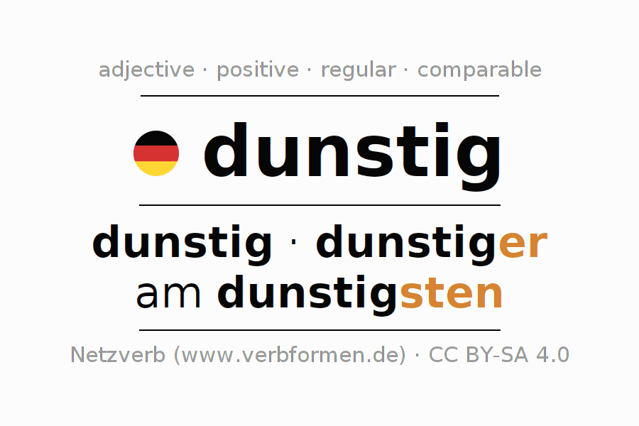 The declension of the adjective dunstig (hazy, misty) uses these forms of the comparison dunstig,dunstiger,am dunstigsten. The endings for the comparison in the comparative and superlative are er/sten. The adjective dunstig can be used both attributively in front of a noun as well as predicative in conjunction with a verb.One can not only inflect and compare dunstig, but all German adjectives. Comments ☆