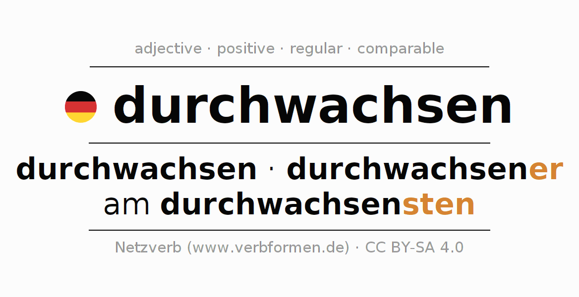 The declension of the adjective durchwachsen (mixed, average) uses these forms of the comparison durchwachsen,durchwachsener,am durchwachsensten. The endings for the comparison in the comparative and superlative are er/sten. The adjective durchwachsen can be used both attributively in front of a noun as well as predicative in conjunction with a verb.One can not only inflect and compare durchwachsen, but all German adjectives. Comments ☆