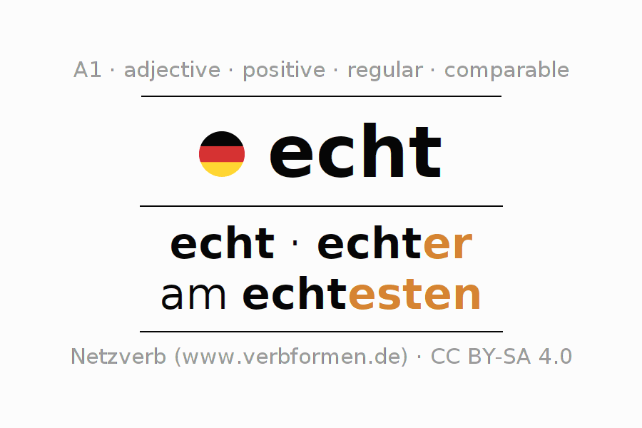 The declension of the adjective echt (genuine, authentic) uses these forms of the comparison echt,echter,am echtesten. The endings for the comparison in the comparative and superlative are er/esten. The adjective echt can be used both attributively in front of a noun as well as predicative in conjunction with a verb.One can not only inflect and compare echt, but all German adjectives. Comments ☆