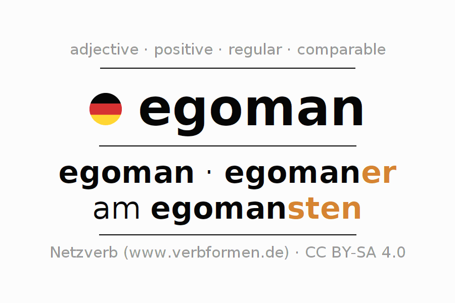 The declension of the adjective egoman (egotistical, self-centered) uses these forms of the comparison egoman,egomaner,am egomansten. The endings for the comparison in the comparative and superlative are er/sten. The adjective egoman can be used both attributively in front of a noun as well as predicative in conjunction with a verb.One can not only inflect and compare egoman, but all German adjectives. Comments ☆