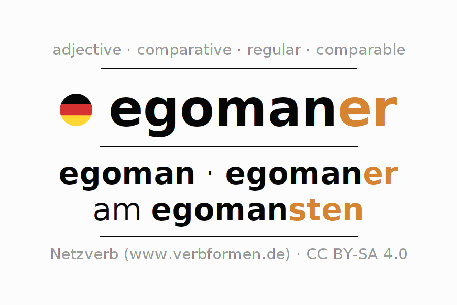 The declension of the adjective egomaner (egotistical, self-centered) uses these forms of the comparison egoman,egomaner,am egomansten. The endings for the comparison in the comparative and superlative are er/sten. The adjective egomaner can be used both attributively in front of a noun as well as predicative in conjunction with a verb.One can not only inflect and compare egomaner, but all German adjectives. Comments ☆